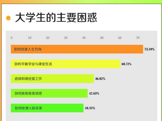 数据显示超过70%的大学生在如何找准人生方向上产生困惑,在面对考研还是工作的问题上也有46.02%的学生产生困惑。许多同学不知道自己以后要“做什么”,其实这主要是因为,我们通常会对自我意识中现实自我的评价过低,使得理想自我和现实自我的差距非常大,以至于认为经过努力也无法实现理想中的自我,或尽管两者距离不大,但由于个人自我掌控能力较弱、前进的动力不强、心态不够积极等个人因素,直接制约理想自我的实现。自我否定类型的同学通常认为自己无法改变现实自我,只有放弃理想自我,服从现实自我,从而埋没或浪费了自己应有的能力。
