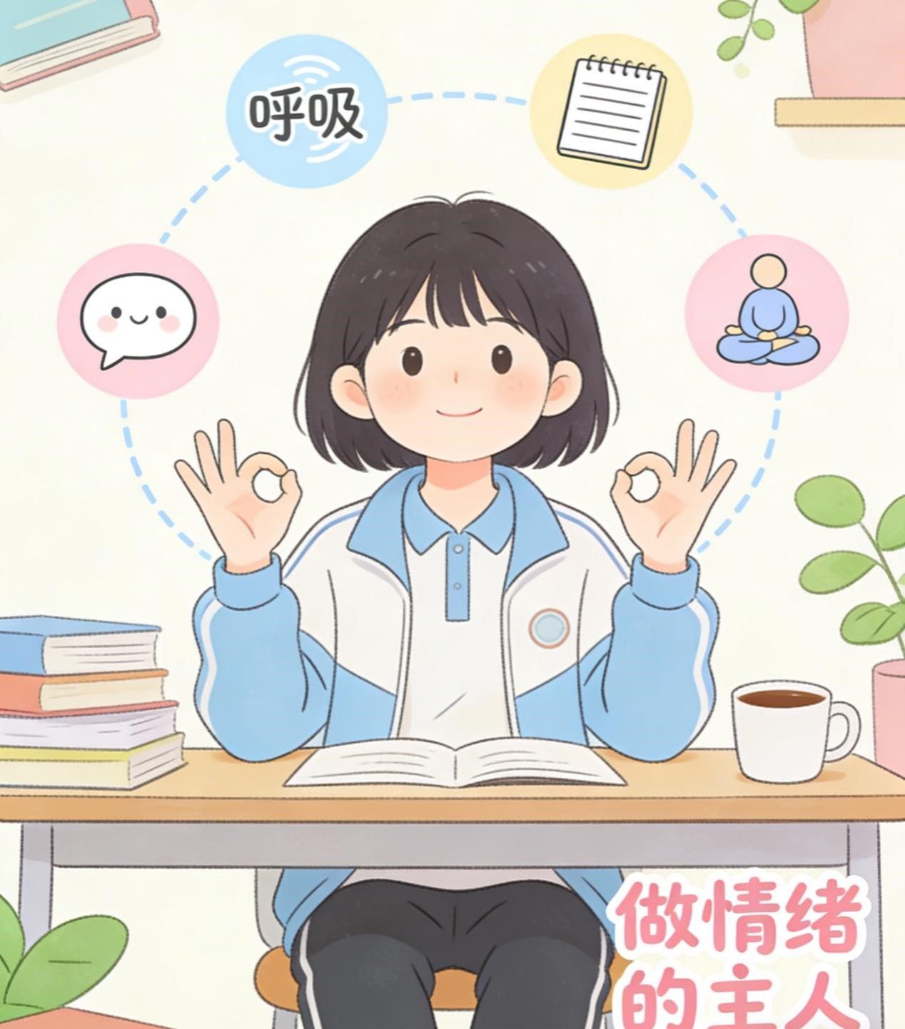 (4)放松:当感到紧张焦虑时,试试深呼吸(吸气 4 秒、屏息 4 秒、呼气 6 秒)、冥想或正念训练,帮助身体和大脑放松下来。
