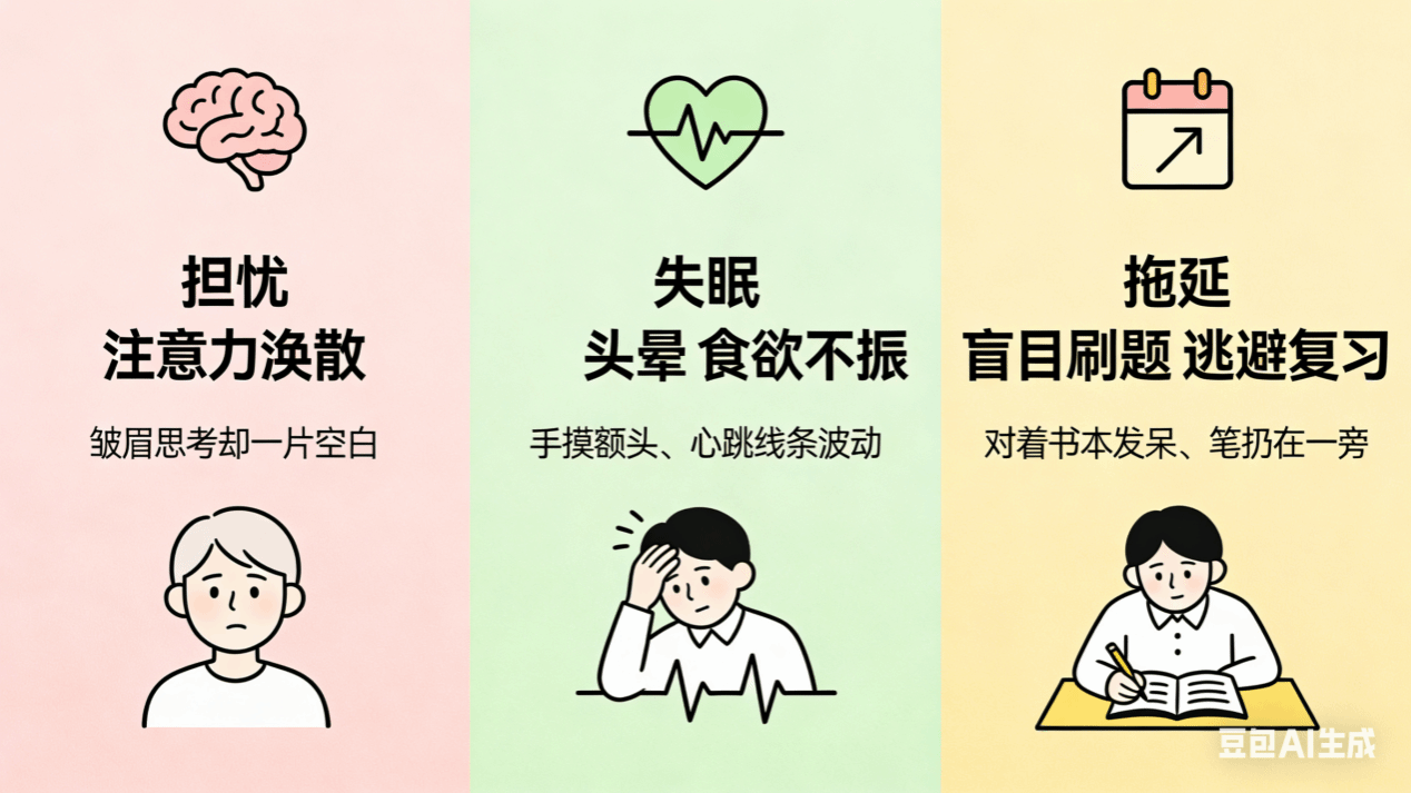 1. 心理层面:过度担忧考试结果,总担心 “考不好怎么办”,出现注意力涣散、记忆力下降、思维迟钝等问题,甚至对复习产生抵触心理;