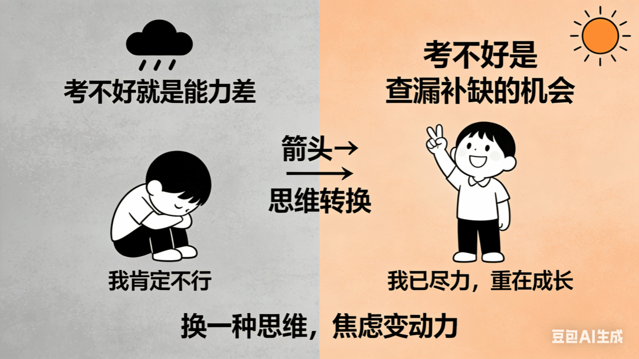 很多时候,焦虑并非源于考试本身,而是源于我们对考试的认知偏差。固定型思维的人会把考试失败等同于 “自我否定”,认为 “考不好就是能力不行”;而成长型思维则会将考试视为检验学习成果、发现问题的机会。