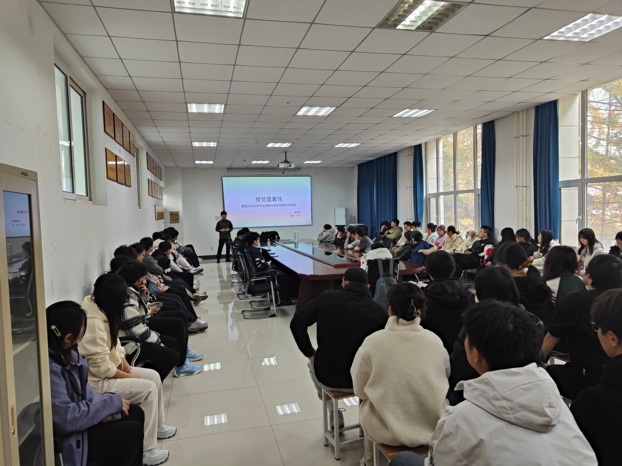 为营造良好学术氛围,激励科研创新活力,拓宽研究生学术视野,进一步促进学院青年博士教师与研究生之间的学术交流,2025年10月27日14时,由东北电力大学科技产业处主办,计算机学院承办的“东北电力大学博士论坛系列学术报告在计算机楼201会议室成功举行。计算机学院青年教师娄建勋博士作了题为《视觉显著性:建模方法及在专业图像处理中的潜力与挑战》的学术报告。计算机学院博士教师、研究生代表70余人参加报告会,计算机学院副院长张秋实主持报告会。